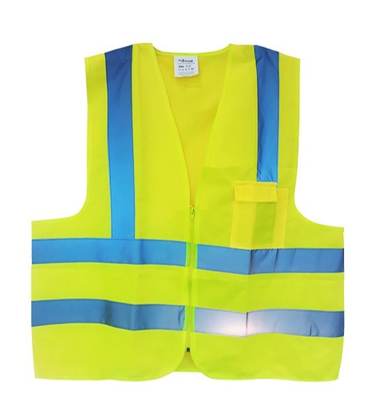 Confeccionado em tecido de poliéster fluorescente nas cores amarelo , com faixas refletivas e fechamento frontal através de zíper.