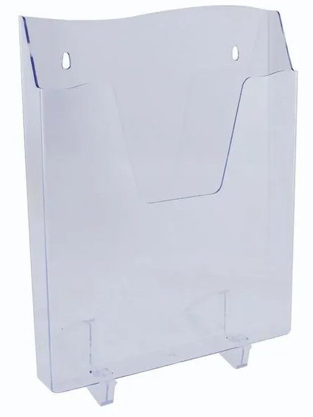 Expositor em poliestireno. Pode ser utilizado em cima da mesa (pés removíveis) ou fixado na parede. Possui dimensão de 233 x 40 x 295 mm.l